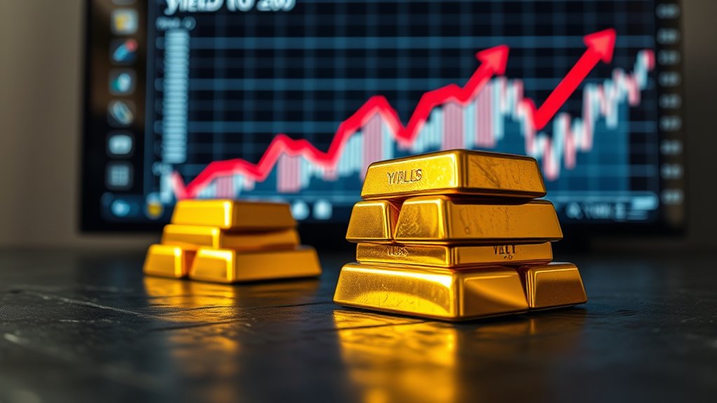 You see, inflation expectations shape how yields and gold interact. When investors anticipate higher inflation, they often buy gold as a hedge, which can lower real yields. This increased demand for gold makes it more attractive, especially if monetary policy keeps real rates low. But be aware, gold’s response isn’t straightforward; it depends on whether inflation expectations are driven by actual economic conditions or market sentiment.
