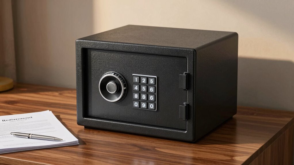 Choosing the right locking mechanism is essential for ensuring your retirement documents stay secure in a fireproof safe. Digital keypad locks offer quick, convenient access with customizable codes, including features like temporary codes and audit trails for added security. Mechanical key locks are straightforward and reliable but require physically retrieving the key, which can be less convenient. Biometric locks use fingerprint or other biometric data for hands-free, secure access, reducing the risk of losing keys or forgetting codes. Combination locks rely on memorized sequences, providing security but potentially less convenient during emergencies. Some safes combine multiple locks, like digital and key mechanisms, offering redundancy and enhanced protection. Your choice depends on balancing ease of access with security needs.