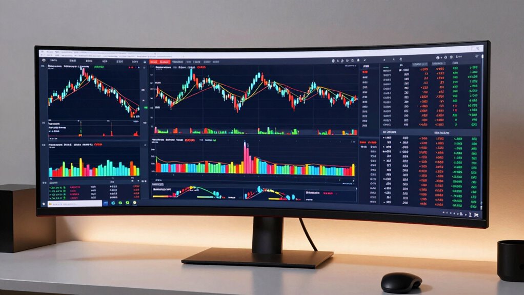 Multitasking is essential when trading on a 34-inch ultrawide monitor, and the right features can greatly boost your efficiency. Look for monitors that support PIP (Picture-in-Picture) and PBP (Picture-by-Picture) modes, enabling you to view multiple data sources or charts simultaneously without switching windows. Multiple input ports such as HDMI, DisplayPort, and USB-C make connecting various devices straightforward, keeping your setup flexible. Adjustable split-screen options let you customize your workspace, displaying multiple applications or charts side by side to maximize productivity. An ultra-wide 21:9 aspect ratio provides ample horizontal space, reducing the need to toggle between screens. Software tools like OnScreen Control further simplify managing multiple windows, helping you stay organized during fast-paced trading sessions.