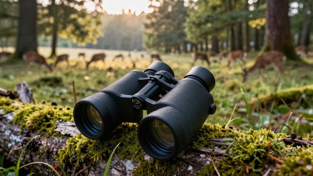 Weatherproofing is essential because outdoor conditions can change rapidly, and you want your binoculars to perform reliably no matter the weather. Look for models with an IPX7 or higher waterproof rating to handle heavy rain and splashes. Fogproof features are equally important; choose binoculars that are nitrogen-purged or argon-filled to prevent internal fogging in humid or cold environments. Make certain they have O-ring seals around the lenses and body for a reliable water barrier. Rugged, rubber-armored exteriors provide shock absorption and protect internal components from impacts and harsh conditions. Finally, verify that the binoculars are tested and certified for weather resistance. These features ensure your binoculars withstand the elements, so you can focus on wildlife without worry.
