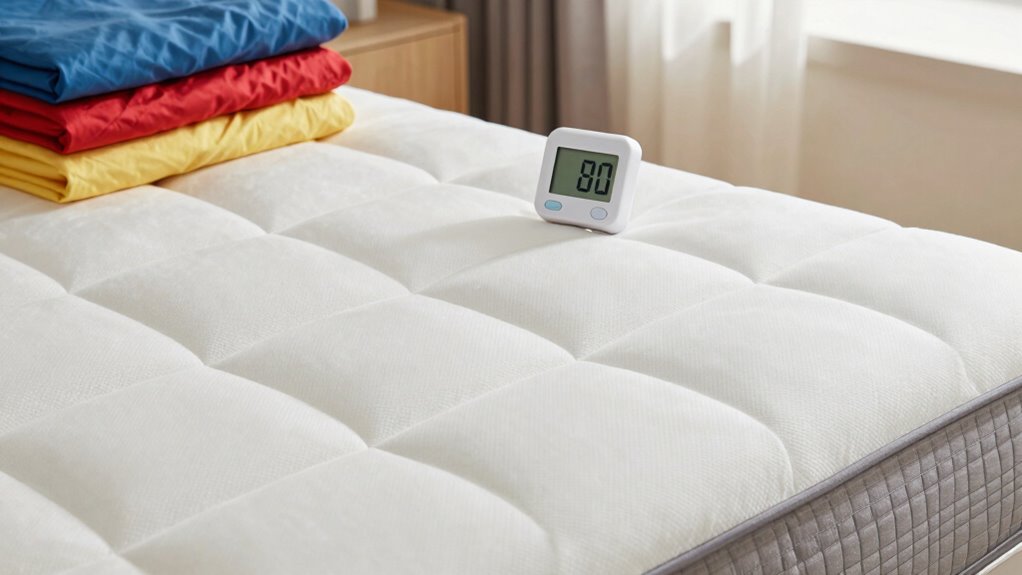 Moisture-wicking abilities are essential when choosing a cooling mattress topper, especially if you tend to sweat during the night. These toppers are designed to pull moisture away from your skin, keeping you dry and comfortable. Fabrics like bamboo-derived viscose, cooling microfiber, and breathable nylon excel at managing moisture due to their superior properties. Their effectiveness is measured by how well they reduce surface humidity and maintain a dry sleeping surface. Proper moisture-wicking helps prevent mold and bacterial growth caused by excess moisture buildup in your mattress. Choosing a topper with high moisture-wicking performance can notably boost comfort, especially for hot sleepers. It ensures you stay dry throughout the night, promoting better sleep quality and overall hygiene.