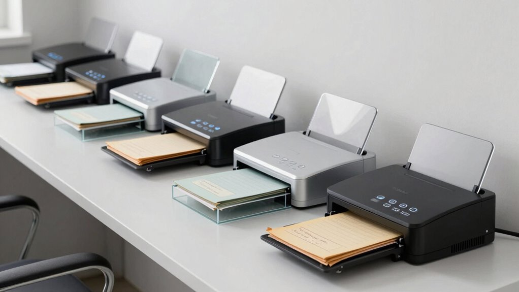 Selecting a desktop scanner that supports a variety of document types is vital for thorough digitization of retirement files. You want to guarantee it can handle standard papers, thick documents, IDs, and plastic cards, so nothing gets left behind. Check if the scanner can process different sizes, from small business cards to long documents up to 72 inches, for versatile use. Compatibility with various file formats, such as searchable PDFs, JPEGs, and editable Word or Excel files, is also indispensable for flexible document management. Additionally, verify the OCR capabilities to convert images into text-searchable and editable digital files. Finally, consider whether it integrates smoothly with cloud storage and document management software, making organization and access effortless. This broad compatibility guarantees a complete and efficient digitization process.