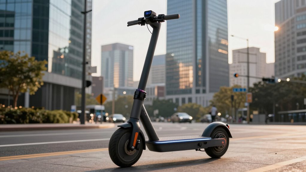 Safety features and lighting play a crucial role in guaranteeing a secure ride, especially over long distances and in low-light conditions. Dual braking systems like EABS, disc brakes, or drum brakes provide reliable stopping power, which is essential for safety. Bright LED headlights, taillights, and turn signals improve visibility at night and help signal your intentions to pedestrians and vehicles. Additional lighting, such as ambient or under-deck lights, can further increase your presence on the road. Certified safety standards like UL2272 ensure that electrical components and lighting systems meet strict safety requirements. Reflectors and flashing lights also boost visibility from multiple angles, making sure you’re seen in various environments. These safety features are indispensable to protect yourself during extended rides and low-light conditions.