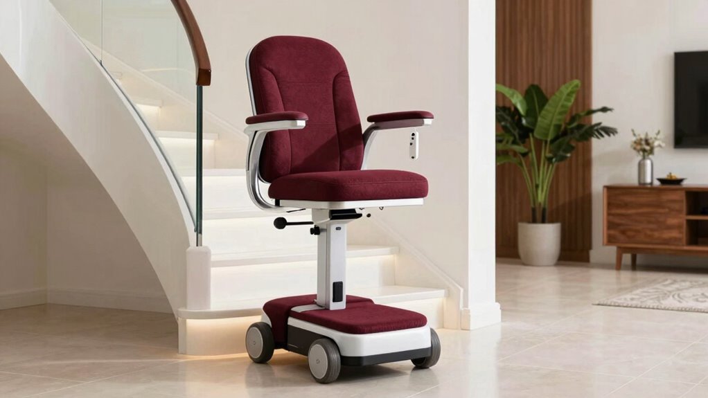 Safety features play a crucial role in ensuring that your stair lift operates securely and reliably. I look for models equipped with seat belts, sensors, and automatic brakes to prevent falls and provide peace of mind. Emergency stop buttons are essential for halting the lift immediately if needed, while backup power systems guarantee operation during outages. Anti-slip surfaces on footrests and handrails give extra grip, reducing the risk of slipping during transfers. Cushioned seats and padding add comfort and help minimize injury if a sudden stop occurs. Safety sensors that detect obstacles are vital, as they automatically stop the lift to prevent accidents, protecting both users and caregivers. Prioritizing these features makes sure the lift is as safe and dependable as possible.