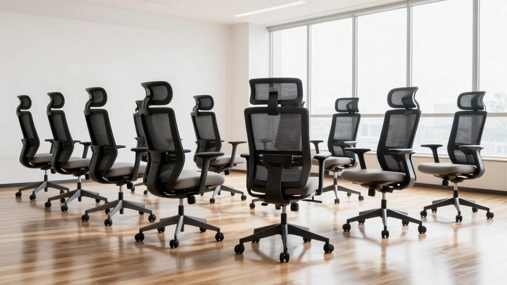 Ensuring your ergonomic chair can support your weight comfortably is essential for maintaining back health and safety throughout the day. Most chairs designed for back pain support weight limits between 250 and 400 pounds, catering to different body types. Chairs with higher weight capacities usually have reinforced frames, sturdy bases, and heavy-duty gas lifts to guarantee stability and durability. Exceeding the chair’s maximum weight can lead to decreased support, faster wear, and safety risks. To get long-lasting ergonomic benefits, choose a chair with a weight capacity that matches or exceeds your body weight. Always check the manufacturer’s specified weight limit before purchasing, so you know it can support you during extended use and help prevent potential issues.