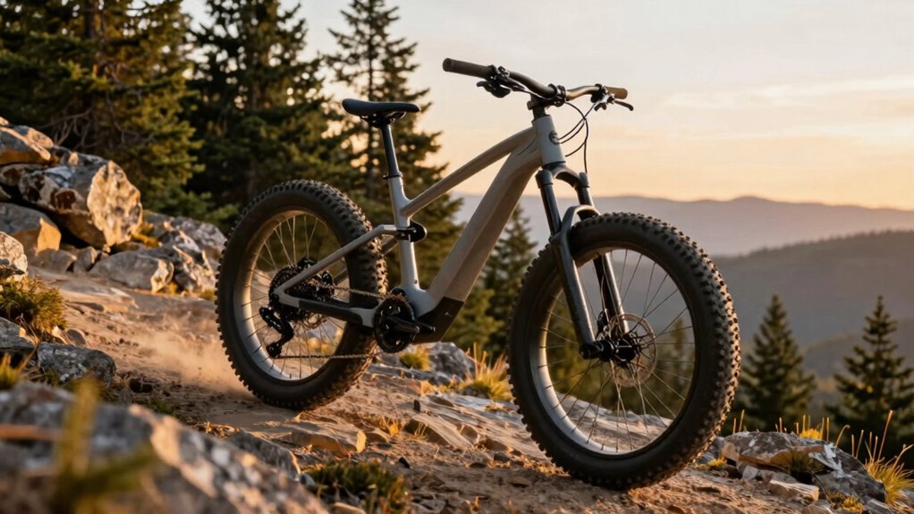 When selecting the right fat tire size for an all-terrain e-bike, it’s essential to take into account how the tire dimensions impact performance and handling. Larger tires, like 26×4 or 20×4 inches, offer better traction and stability on uneven, off-road surfaces, making them ideal for mountain trails. Smaller tires, such as 16×4 inches, are more agile and better suited for urban environments with some off-road sections. Tire size also affects ride comfort; bigger tires absorb shocks more effectively, providing a smoother ride on rough terrain. Additionally, larger tires add weight and bulk, impacting portability. Different terrains call for specific sizes: 20-inch tires excel in snow and sand, while 26-inch tires perform better on mountain trails.
