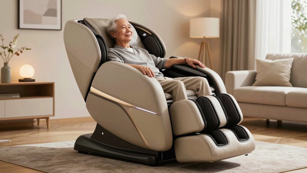 Since ease of use is crucial for seniors, selecting a massage chair with intuitive controls can make a big difference in their comfort and independence. Look for chairs with large touchscreens or simple remote controls that are easy to understand and operate. Features like voice control or app connectivity can offer hands-free adjustments, adding convenience. Ergonomic design elements, such as easy-to-reach buttons and straightforward layouts, prevent confusion and frustration. Adjustable settings for massage intensity, position, and heat should be simple to customize, ideally with preset options for quick adjustments. Safety features like auto-stop functions and clearly labeled controls are essential to prevent mishaps and ensure worry-free use. Prioritizing these ease of use features helps seniors enjoy the full benefits of their massage chair comfortably and confidently.