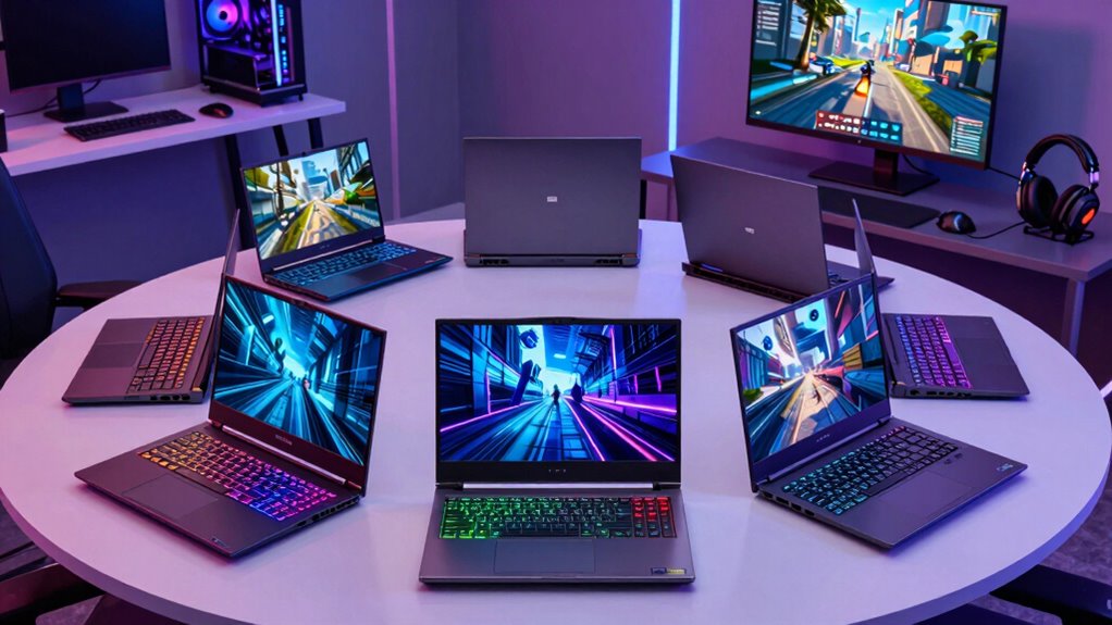 With so many solid options under $1000, you’ll find a gaming laptop that fits your needs without breaking the bank. While some might worry about sacrificing performance for affordability, today’s mid-range models pack impressive power thanks to advanced GPUs and fast processors. Remember, choosing the right laptop depends on your specific gaming and multitasking needs. Investing a little time to compare these models guarantees you’ll enjoy smooth gameplay without compromise, even at a budget-friendly price.