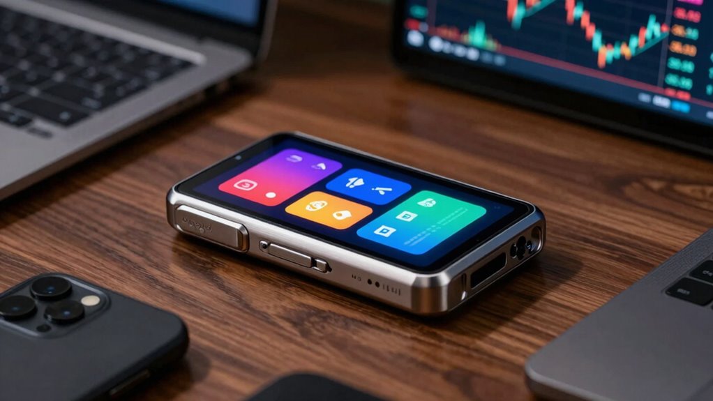 A long-lasting battery is essential for a hardware wallet with a touchscreen, especially if you plan to use it on the go or during extended periods without access to charging sources. A device with better battery life guarantees it stays operational during long trips or daily use without frequent recharging. Wireless charging, like Qi2 compatibility, adds convenience, letting you recharge without cables. Devices with rechargeable batteries usually specify their capacity in mAh, which helps gauge how long they’ll last between charges. An efficient hardware design and low-power display can also considerably extend battery life. Additionally, regular firmware updates can optimize power consumption, preserving battery life over time. Prioritizing these features means your wallet remains reliable, ready, and easy to use whenever you need it.
