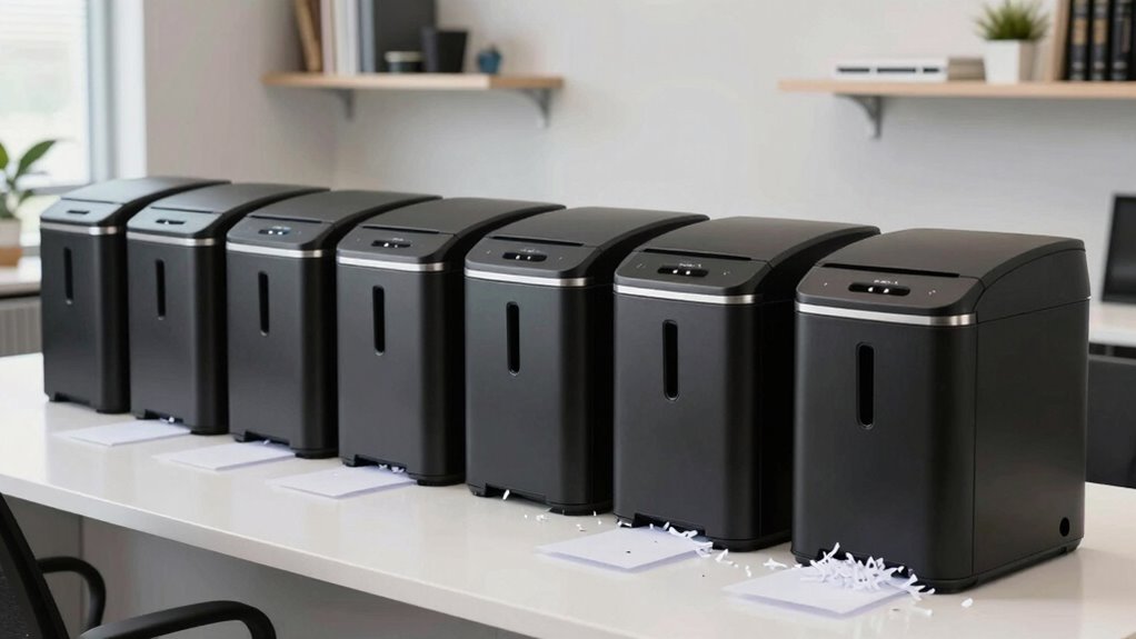 If you’re looking for the best high-capacity shredders for small offices in 2026, I recommend models like Bonsaii’s heavy-duty cross-cut and micro-cut shredders, Amazon Basics’ auto feed shredder, and BONSEN’s large-volume units. These machines handle up to 300 sheets, offer secure P-4 or P-5 shredding particles, and run continuously for up to 60 minutes. They’re easy to operate, maintain, and move around, ensuring smooth office workflow. Keep going to find out which one fits your needs best.