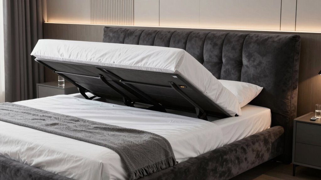 The adjustable range and angles of a high-end bed play a crucial role in customizing your comfort, with head angles typically reaching up to 65-75 degrees and foot angles up to 45 degrees. This wide range allows you to find the perfect position for reading, sleeping, or lounging. Higher-end models often feature independent control of head and foot sections, giving you greater flexibility to tailor support. Many premium beds include zero gravity settings, which elevate your legs and head to simulate weightlessness, enhancing relaxation. Some models also offer additional features like pillow tilt or multi-position presets for ergonomic support. Smooth, motorized adjustments ensure precise control, letting you achieve and maintain your preferred angles safely and comfortably.