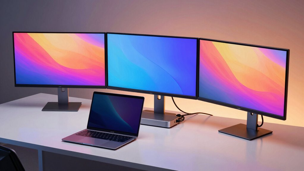 Selecting a docking station with the right port options is vital for creating an efficient triple monitor setup. I look for stations offering multiple video output ports like HDMI, DisplayPort, and VGA to support various monitor configurations. It’s important these ports support high resolutions, such as 4K at 60Hz, to guarantee sharp, clear displays across all screens. I also verify that there are enough USB ports—both USB-A and USB-C—to connect peripherals and accessories needed for my workflow. An Ethernet port is indispensable if I require wired internet for stability. Finally, I check for a dedicated Power Delivery port to charge my laptop while running multiple monitors and peripherals, keeping my workspace tidy and efficient.