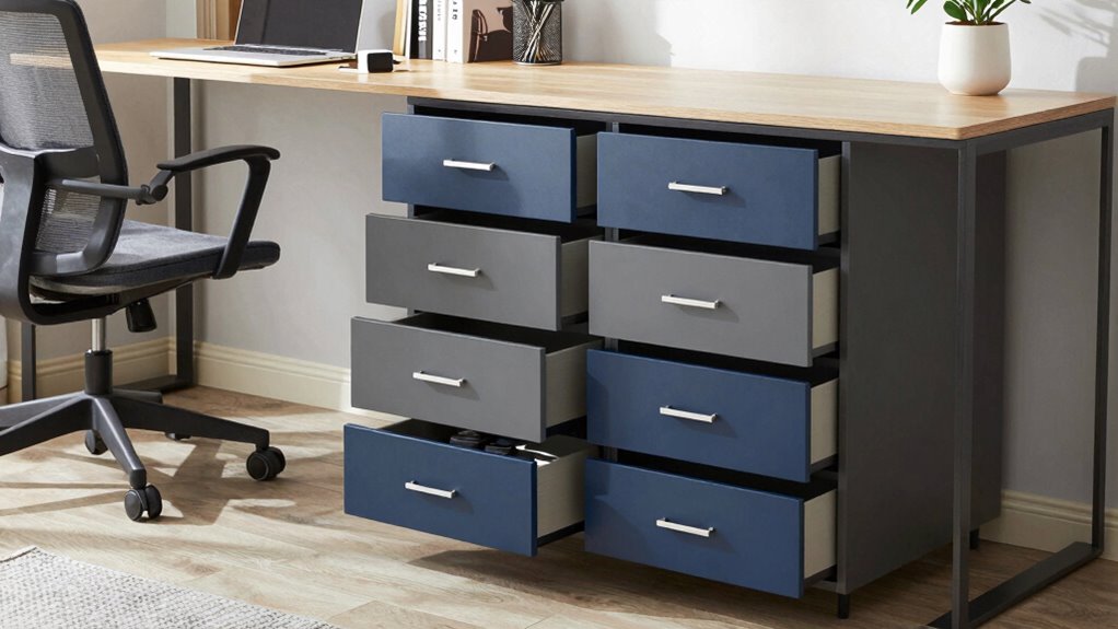 Ever wondered how to pick the perfect size for your home office storage? I always start by measuring my space and listing what I need to store—whether it’s important documents, gadgets, or supplies. I look for drawers that comfortably fit my essentials without crowding. Choosing a size that balances capacity and space guarantees everything stays organized and accessible, making my workday smoother and more efficient.