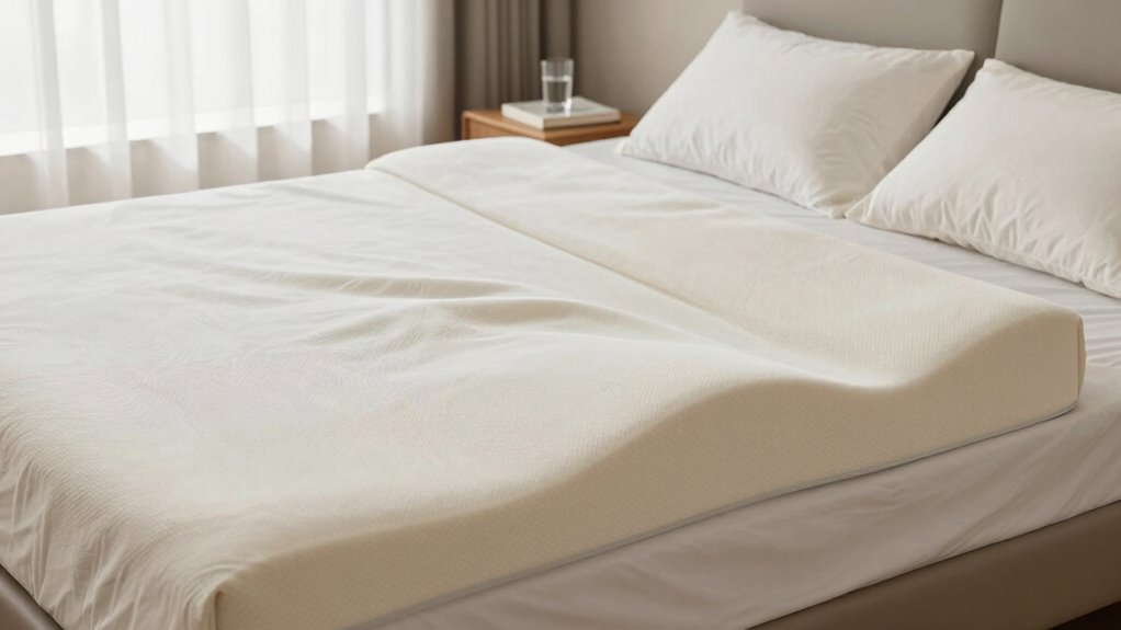 Maintaining proper spinal alignment is essential for side sleepers to wake up feeling refreshed and free from discomfort. A good memory foam mattress supports the natural curve of your spine, reducing back pain and nerve compression. Targeted pressure relief and contouring help cushion your shoulders and hips, preventing misalignment at these critical points. Zoned support systems are especially beneficial, offering firmer support in the lumbar area while allowing softer cushioning at the shoulders and hips. For ideal support, a medium to medium-firm mattress usually works best, balancing softness with necessary support. Proper spinal alignment not only minimizes discomfort but also promotes long-term spinal health, making your sleep more restorative and pain-free. Prioritizing support features ensures you wake up feeling refreshed and aligned.