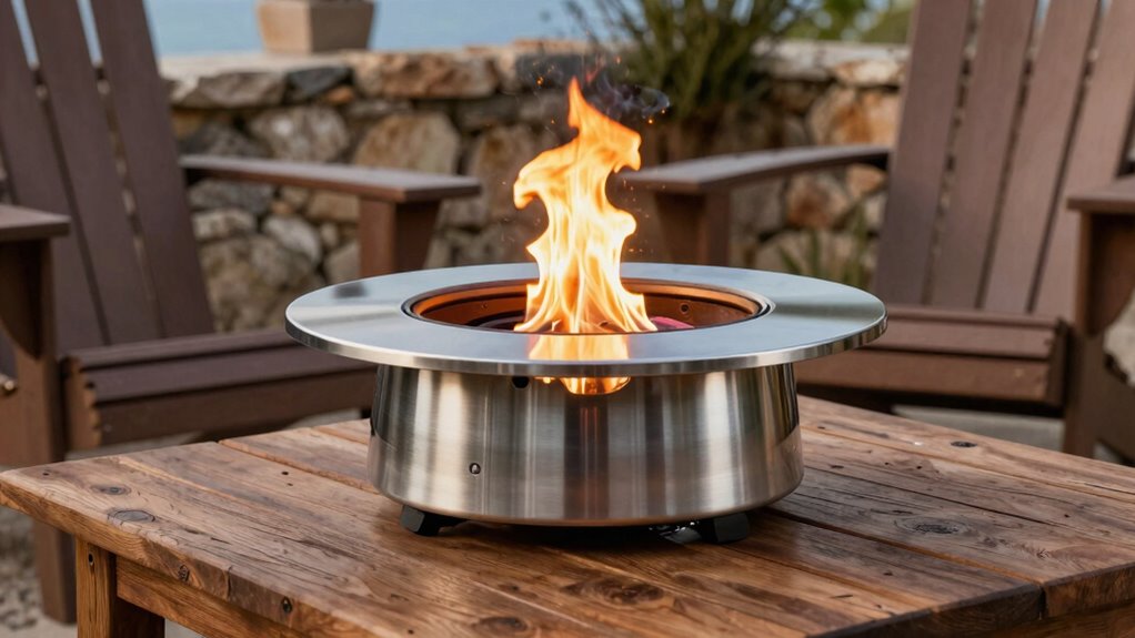 Durability and materials are crucial factors that determine how well a portable propane fire pit holds up over time. I look for fire pits made from sturdy steel or cast iron because they resist outdoor elements and frequent use. Weather-resistant finishes, like enamel, powder coating, or rust-proof coatings, are essential to prevent corrosion and extend the lifespan. Stainless steel burners and components boost resistance to heat and rust, ensuring reliable performance for years. Reinforced construction with heavy-duty materials minimizes warping, cracking, or damage from UV exposure and harsh weather. Additionally, portable features should not compromise structural integrity; well-designed foldable or lightweight models must still be durable during transport and storage. Overall, quality materials and construction are key to long-lasting performance.