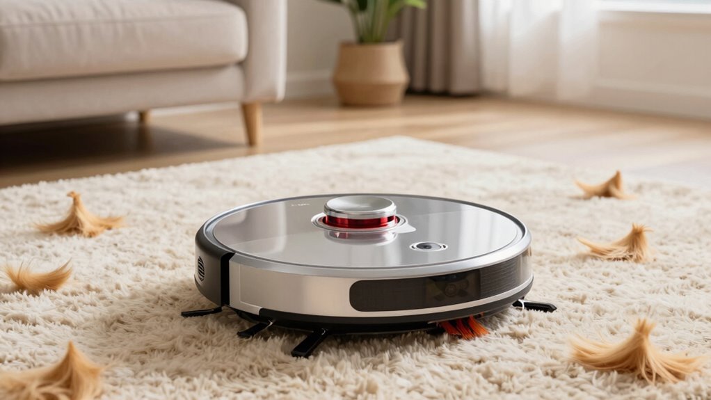 High-end robot vacuums handle multiple pet hair types by using advanced brushes and strong suction power. I’ve found they easily pick up fine, curly hair and thicker, matted fur without clogging. They intelligently adjust suction levels and use specialized filters to trap allergens. This means I don’t have to worry about different hair textures; my vacuum manages them all efficiently, keeping my home clean and allergen-free.