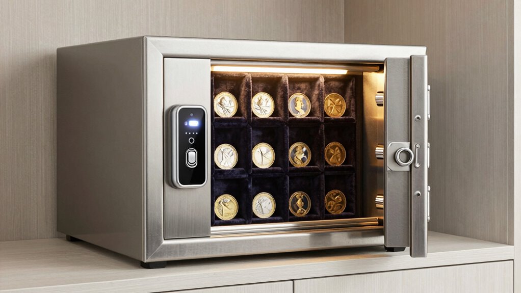 Think of your coin collection as a treasure chest waiting to be uncovered. Choosing the right safe is like finding the perfect guardian to keep your treasures secure and shining bright through time’s storms. With options like lockable safes and specialized holders, you can protect your collection like a lighthouse guiding ships safely home. So, pick your shield wisely, and let your coins tell their stories for generations to come.