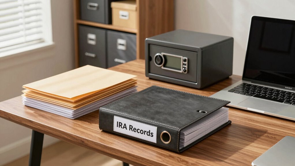 To guarantee compliance with IRS record retention requirements, I keep detailed records of all IRA distributions, including statements and receipts, for at least five years. I organize these documents securely, either digitally with encrypted backups or in a fireproof safe. Regularly reviewing IRS guidelines helps me stay updated. I also consult a tax professional annually to confirm I’m meeting all record-keeping obligations and deadlines.