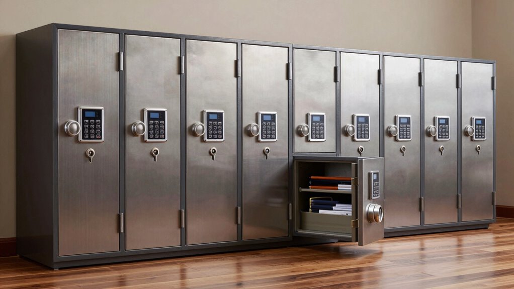 When safeguarding checkbooks and important documents, fire and water resistance are crucial factors to contemplate, especially in emergencies. Fire-resistant safes are tested to endure high temperatures up to 1550°F for at least 30 minutes, protecting contents during a blaze. Water-resistant safes are designed to prevent damage from water exposure, often tested in water for 72 hours at depths up to 8 inches. Fireproof safes use specialized insulation materials that keep interior temperatures below critical thresholds, even during a fire. Many feature seals and gaskets to improve protection against moisture and water infiltration. When choosing a safe, always verify its certification standards, such as UL or ETL ratings, to ensure it reliably guards against fire and water damage, giving you peace of mind in emergencies.