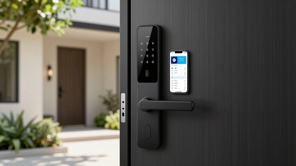 Security features are the backbone of any smart lock, ensuring your home stays protected against unauthorized access. Advanced smart locks use encryption protocols like AES128 to safeguard your data and access codes from hacking attempts. Features like anti-peeping keypads, auto-lock, passage modes, and low battery alerts bolster security and convenience. Multi-factor authentication options, including fingerprint scans, PIN codes, app control, and mechanical keys, create layered protection that’s hard to bypass. Tamper alarms and lockout modes activate after multiple failed attempts, discouraging intruders. Additionally, integration with voice assistants allows for secure voice commands, adding an extra layer of control. These features work together to make sure your front door remains secure while providing peace of mind and ease of access.
