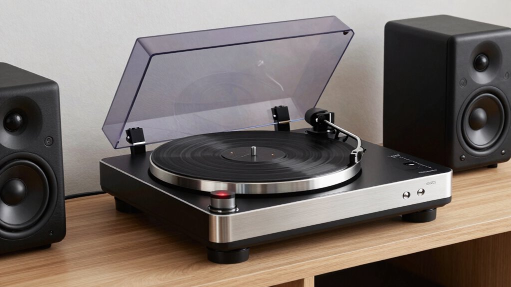 I get it, maintaining high-end turntable speakers might seem intimidating, but with a few simple steps, it’s manageable. I regularly dust the speakers, keep them in a stable environment, and check connections for corrosion. I also make certain the speakers are calibrated correctly and avoid exposing them to extreme temperatures or humidity. With minimal effort, your speakers stay in top shape, delivering premium sound for years.